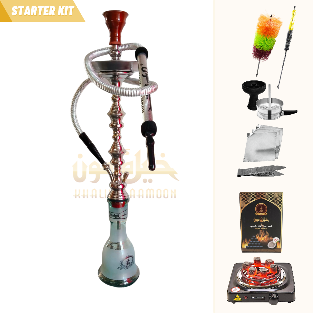 الخراطيم: خراطيم خليل مأمون™ هي من أفضل الخراطيم الموجودة. فهي توفر قوة سحب كبيرة وجميلة من الناحية الجمالية. خراطيم خليل مأمون™ التقليدية مصنوعة من جلد البقر ويتم نسجها ولصقها يدويًا. ونظرًا لطبيعة الجلد، فقد تظهر تغيرات طفيفة في اللون. وقد تلاحظ أيضًا بعض الغراء الزائد في الأماكن التي يتم فيها لصق أجزاء مختلفة من الخرطوم معًا. وهذا أمر طبيعي تمامًا ولا يؤثر على الدخان بأي شكل من الأشكال.